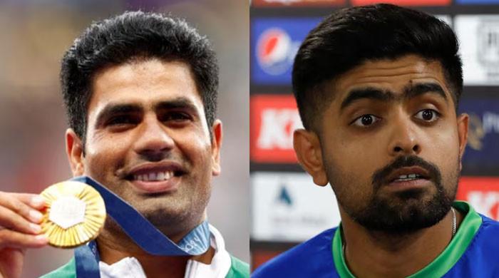Pakistan's javelin thrower Arshad Nadeem posing with his Olympic gold medal at the Paris Olympics 2024 and Pakistan's white-ball cricket team captain Babar Azam attending a press conference. — Reuters/File
