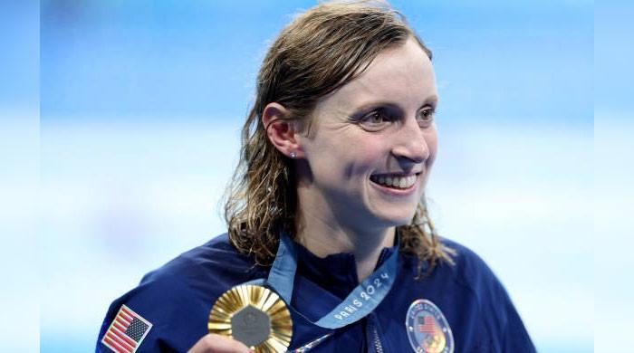 US swim star Katie Ledecky shows her medal. — Geo News/reporter