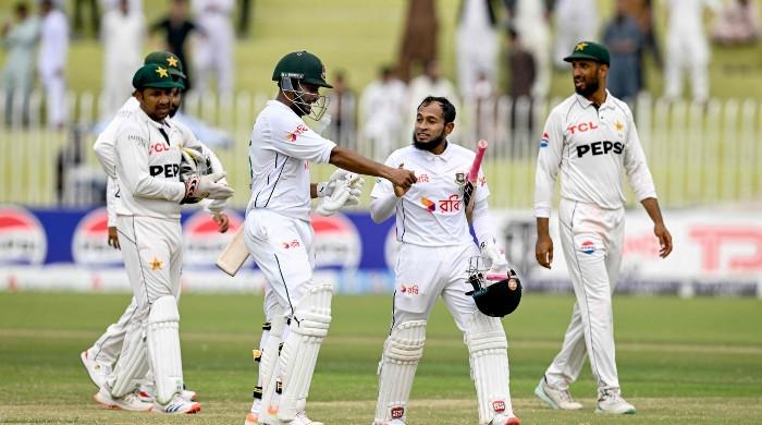 Bangladesh's Mushfiqur Rahim and Shakib Al Hasan celebrate after their team's win at the second Test match against Pakistan, in Rawalpindi Cricket Stadium on September 3, 2024. —AFP